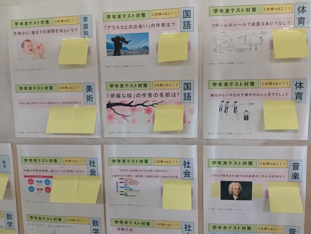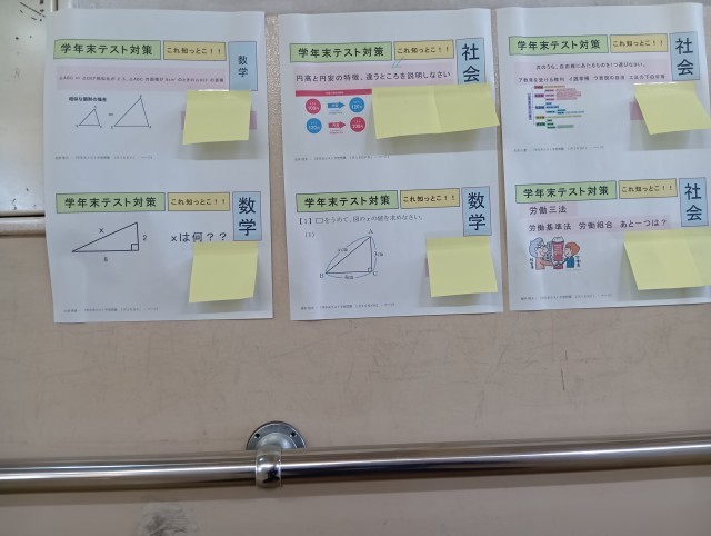 3年生は今日から学年末テストでした。廊下には教科係が作ったテスト予想問題が掲示されています。掲示物も活用しながら残り2日がんばりましょう。