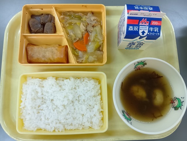 今日の給食は、ごはん、中華丼風、春巻、雷こんにゃく、春雨ともずくのスープ、牛乳です。