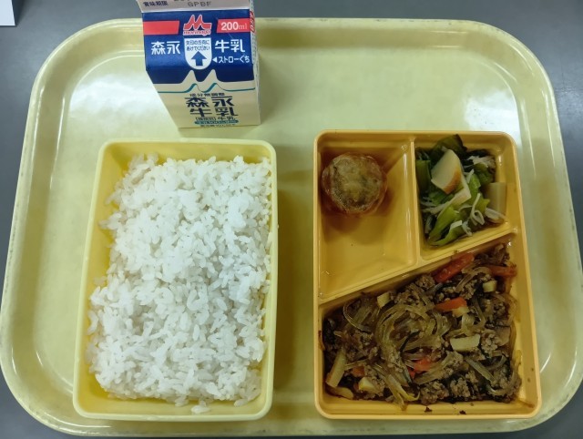 今日の給食は、ごはん、チャプチェ、味噌まんじゅう、チンゲン菜とえのきの和え物、牛乳です。
