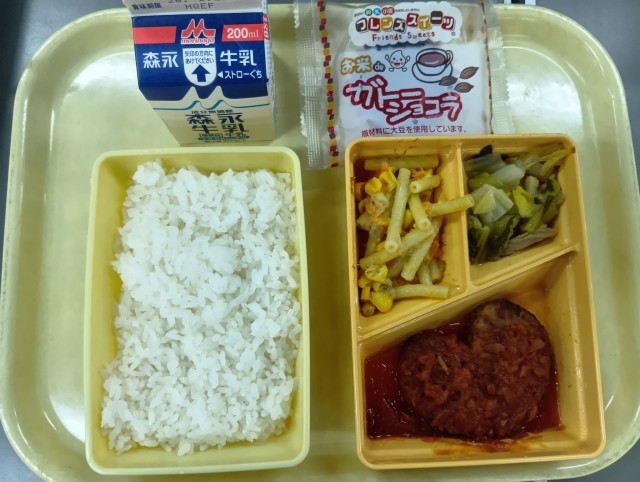 今日の給食は、ごはん、ハート型ハンバーグBBQソース、マカロニサラダ、青菜のベーコン炒め、ガトーショコラ、牛乳です。