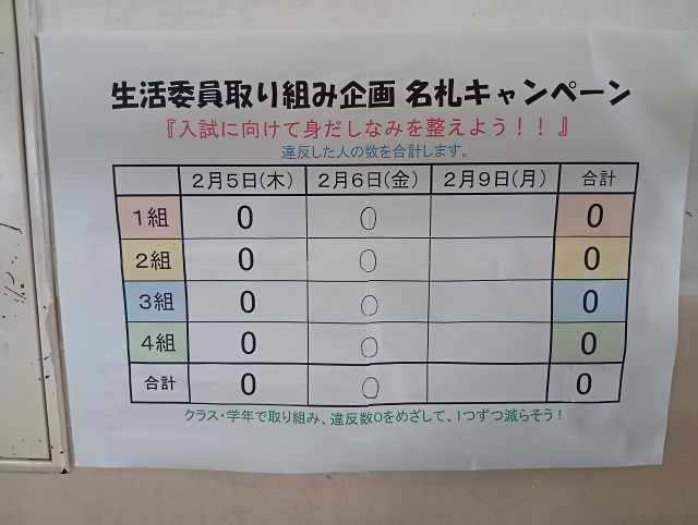 3年生は学年集会を行いました。学級委員からは「私学入試を終えて、公立入試に向けて学年みんなで頑張ろう」という話があり、生活委員からは先日行われた名札キャンペーンの頑張りについての話がありました。来週には進路懇談や卒業式練習が始まります。メリハリをつけて残りの学校生活を有意義なものにしていきましょう。