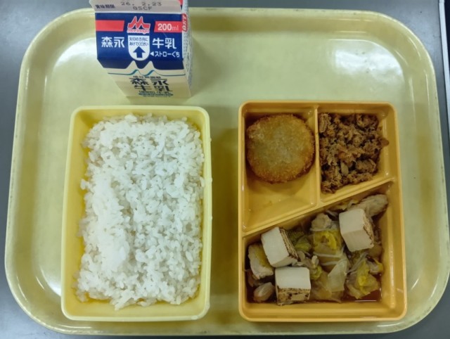 今日の給食は、ごはん、とりすき焼き風にこみ、キムチコロッケ、シーチキンのそぼろ煮、牛乳です。