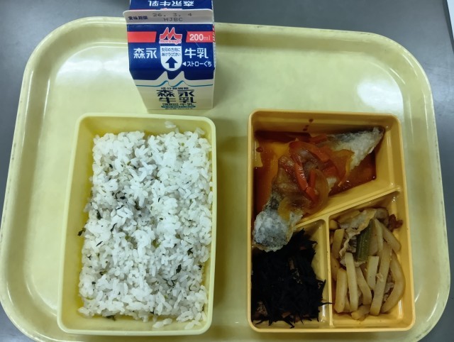 今日の給食は、菜めし、白身魚の野菜ソースかけ、豚バラとじゃがいもの甘辛炒め、ひじきの煮物、牛乳です。