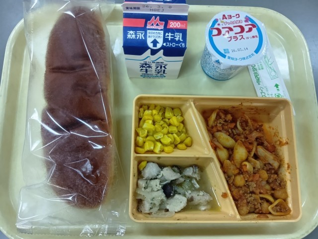 今日の給食は、和三蜜パン、チリコンカーン、鶏としめじの洋風炒め、ボイルコーン、ヨーグルト、牛乳です。