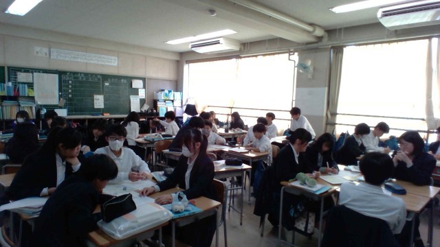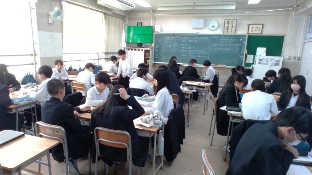 東日本大震災が発生した3月11日を目前にして、家庭科の授業では、もしも災害にあった時、どう行動すればよいかを学ぶために、ゲームをとおして、災害を疑似体験する授業を行っています。