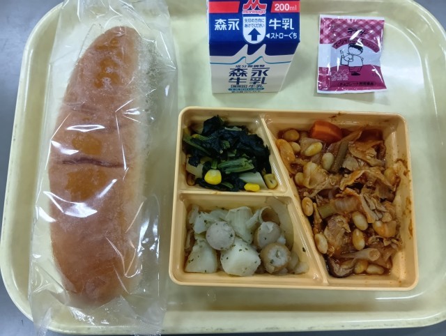 今日の給食は、コッペパン、ポークビーンズ、じゃがソーセージ、ほうれん草のサラダ、チョコレートクリーム、牛乳です。