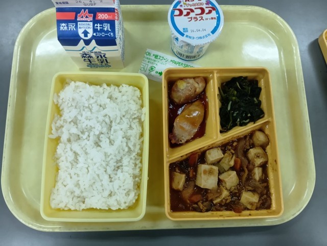 今日の給食は、ごはん、マーボードーフ、鶏肉の照り焼き、ほうれん草のしらす和え、ヨーグルト、牛乳です。