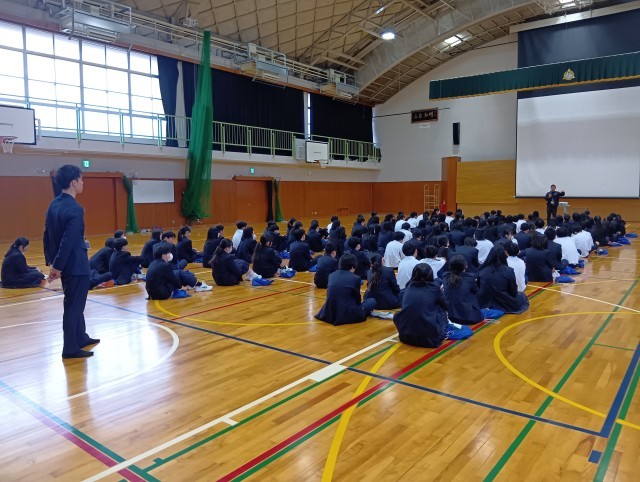 1年間の学校生活について、担当の先生から様々なお話がありました。授業を大事にすること、ルールを守ること、時間を大切にすることなど、当たり前の行動ができる学年にさらになっていくことを期待しています。生徒はとても静かに先生の話を聞くことができていました。