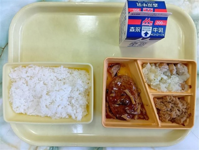 今日のメニューは、白ごはん、照り焼きハンバーグ、じゃがソーセージ、シーチキンのそぼろ煮、牛乳です。