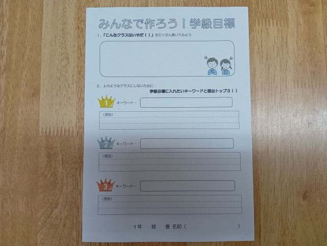 写真は上から、2組、3組です。プリントを使って、みんなで学級目標を考えました。
