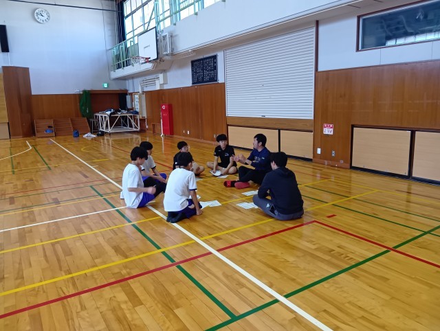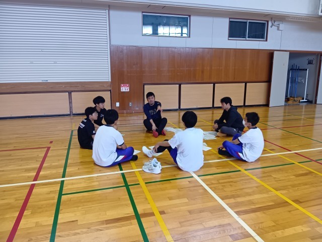 写真は練習後のミーティングの様子です。選抜や公式戦などについて、顧問の先生からお話がありました。