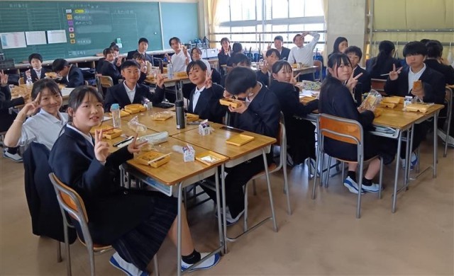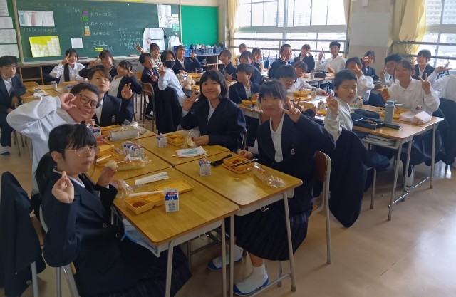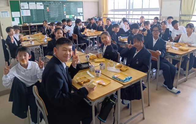 校内探検のあとの給食は格別だったようです。どのクラスも班でおいしそうに給食を食べていました。写真は上から、1組、2組、3組です。