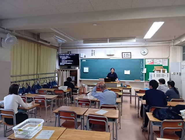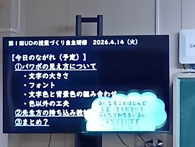 職員会議終了後に本校の通級指導教室担当の先生が講師役になり、ユニバーサルデザインの授業づくりについて、先生方に講義をしてくれました。授業で使用する大型テレビに映し出されたパワーポイントの見え方にも個人差があることが分かりました。字の大きさや使う色を工夫しながら、すべての生徒にとって分かりやすい授業づくりに向けて、とてもよい自主研修会になりました。本校教員の「分かる授業」を生徒のために行おうとする情熱に感心しました。