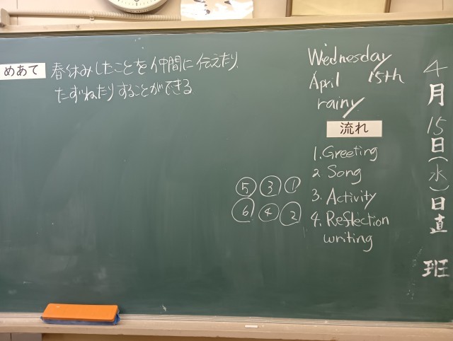 授業のめあては「春休みにしたことを仲間に伝えたり、尋ねたりすることができる」でした。授業前に聞く英語の音楽をみんなで上手に歌うことができていました。歌はとても上手でした。