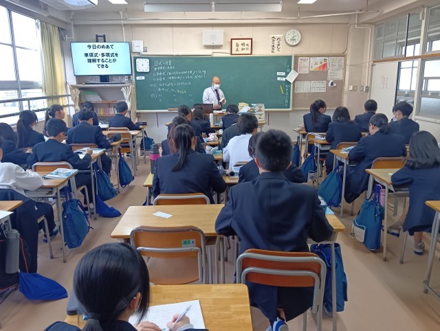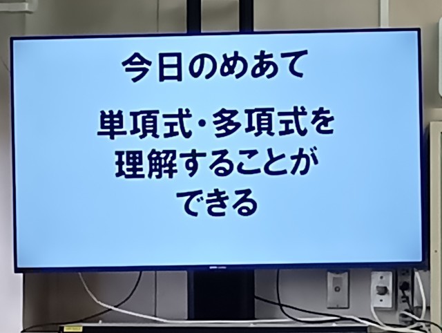 授業のめあては「単項式・多項式を理解することがてきる」でした。生徒は配布された練習問題を一生懸命に解いていました。
