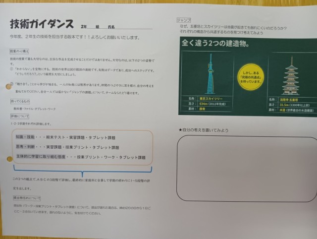 授業の進め方や評価のつけ方、テストなどについてのガイダンスがプリントを使って行われていました。