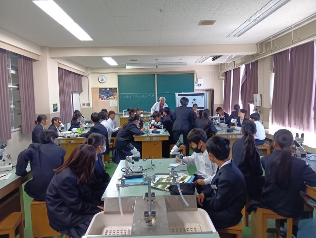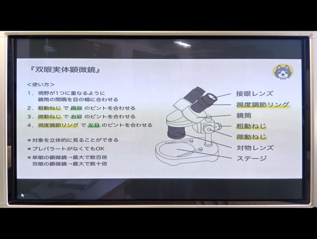 双眼実体顕微鏡の使い方についての授業でした。顕微鏡でしか見えない小さな世界に子どもたちは、興味津々の様子でした。