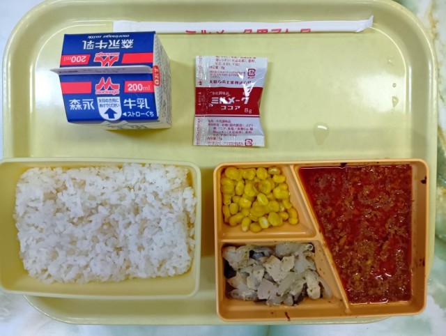 今日のメニューは、もち玄米ごはん、ドライカレー、鶏としめじの洋風炒め、ボイルコーン、ミルメーク、牛乳です。