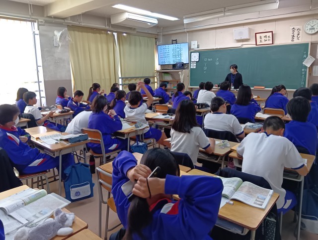 学習内容は「地形図」、授業のめあては「それぞれの地域にどのような特徴があるか地形図を読み取り、説明することができる」でした。午後の授業でしたが、2年生(46期生)は、がんばっていました。