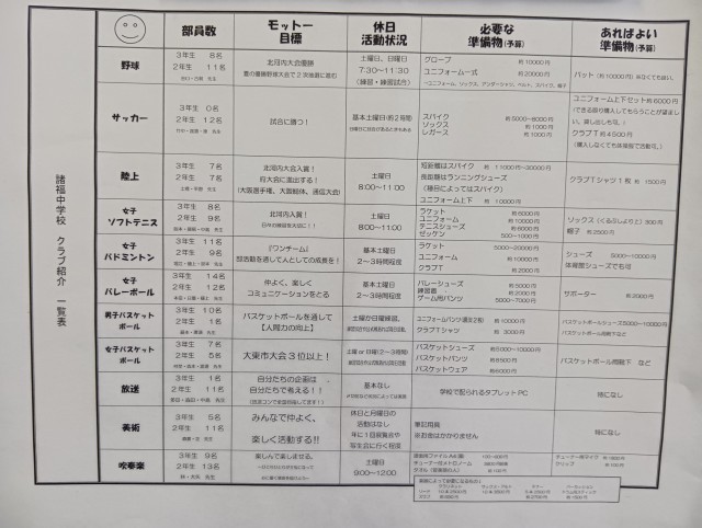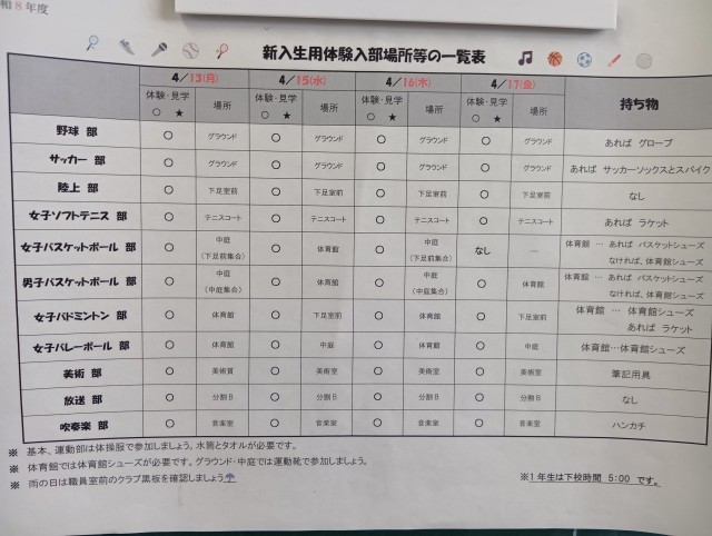 1年生のクラブ体験入部が4日間の予定で行われ、本日が最終日でした。体験入部前には、体験入部予定表や各クラブの紹介が教室に掲示されていました。