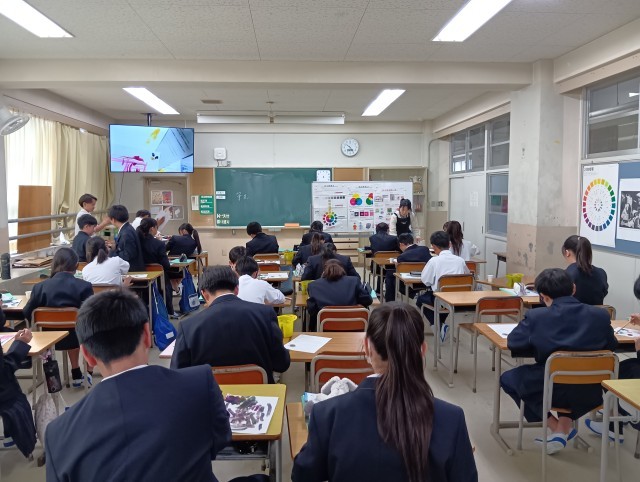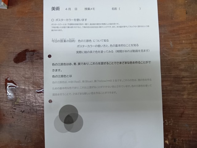 授業のめあては「光の三原色について知る」でした。子どもたちは、絵の具を使って、楽しそうに様々な色を作っていました。