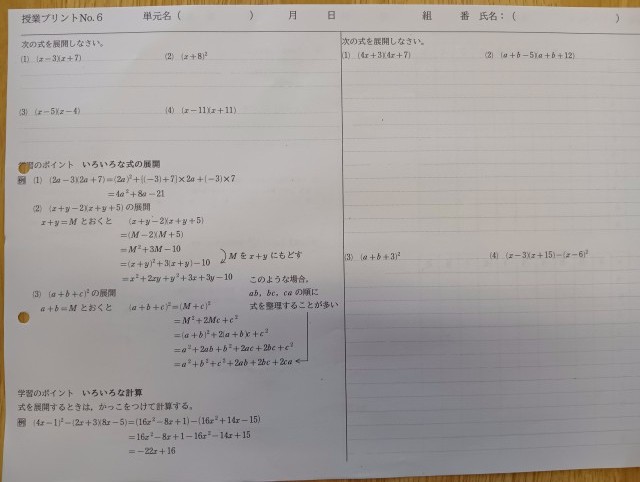 学習内容は「展開」でした。4つある公式を使って、問題を解いていました。次の単元の「因数分解」に繋がる大切な分野です。復習をしっかりしておきましょう。