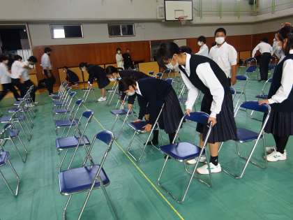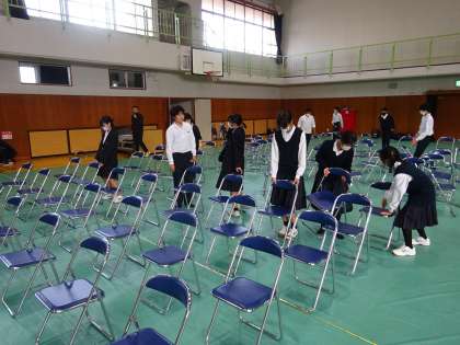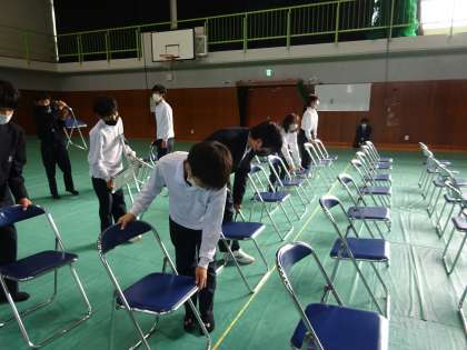 今日は午後から欅祭の準備でした。体育館の会場設営の様子です。みんな丁寧にいすを並べていました。