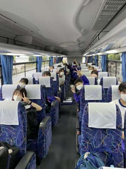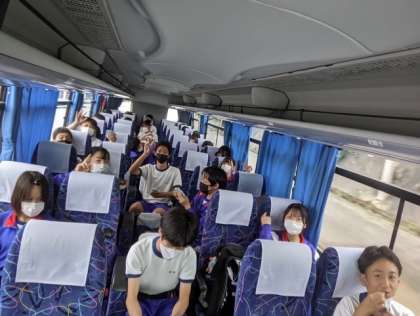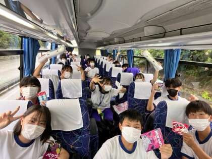 美ら海水族館を出発し、道の駅かでなに向かっています。バスの中ではおやつタイムを楽しんでいます。