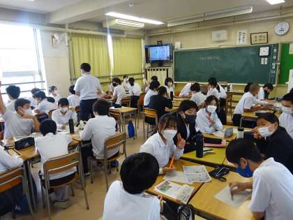 今日の6時間目は宿泊学習の取り組みでした。帰ってきてから作成予定の新聞記事の役割分担をして、琵琶湖博物館の下調べ(巡回ルート決め)をしました。