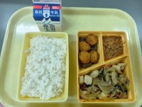 今日の給食は、ごはん・炒めビーフン・高野豆腐の含め煮・牛ひじきそぼろ・牛乳です。