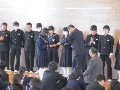 3年生の1年間皆勤賞、クリーン&ジョイフルの皆勤賞、精勤賞の表彰を行いました。
