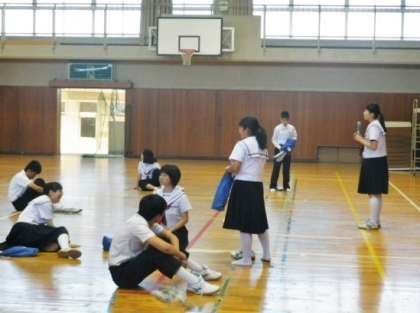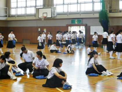 集会開始時間前から 生徒会役員による集合の呼びかけが行われています。 呼びかけに応えて、他の生徒たちもスムーズに所定の位置に並んでいます。