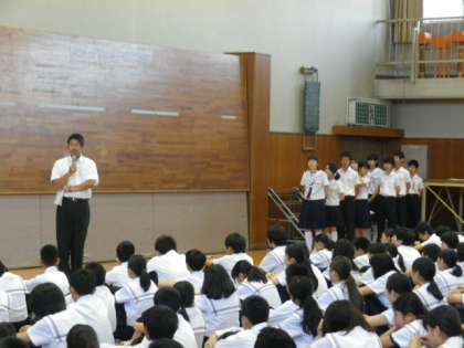 生徒会からは「熱中症」についての注意喚起、生活指導担当の先生からは 今日の集会の集合の様子から「自発的で前向きな行動を意識している生徒のすばらしさ」について話がありました。