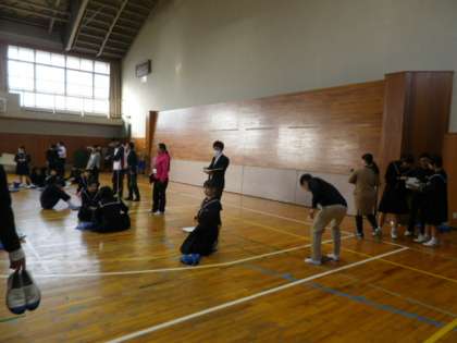写真上:8時20分〜 生徒会役員と先生は、すでに体育館に待機
