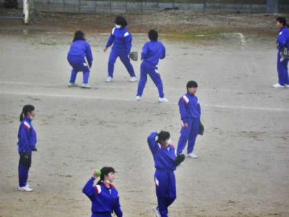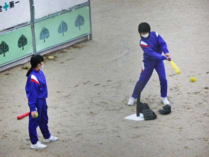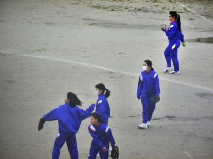 今日はまた とても寒いグラウンドでしたが、1年生女子体育の授業では元気にソフトボールに取り組んでいました。
