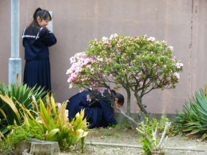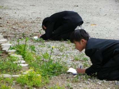 校庭や運動場の花や草木を観察する1年生の純朴な表情が印象的でした。