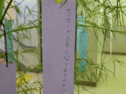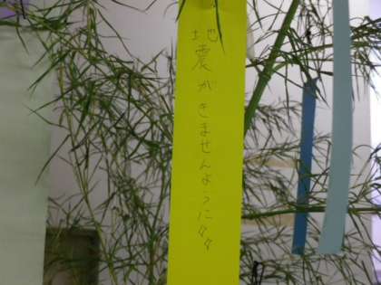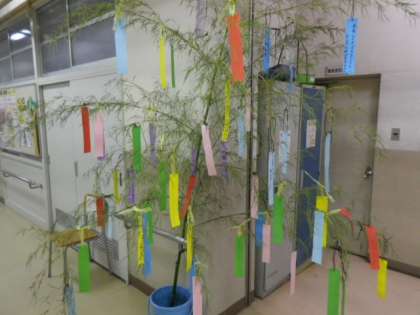 織姫と彦星が 年に一度だけ出会える日にあやかって、職員室前に飾った笹に、生徒たちが思い思いの願い事を書いた短冊を下げました。