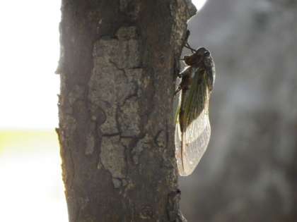 酷暑の中、校長室前の木の葉陰でセミも一休み…