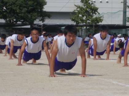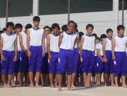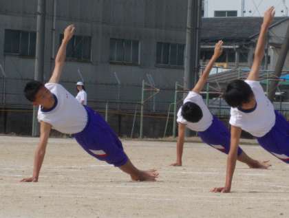 4人のリーダーと体育科の先生が苦労と工夫を重ね、それに全校男子生徒が応えた、誠実さと真面目さが伝わって来る立派な組体操でした。