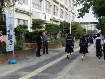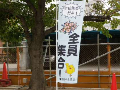本日は「生徒集会」の日。 生徒会本部がデザインした“のぼり”を立てて、集合に遅れないよう促します。