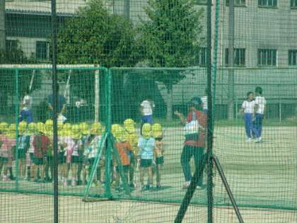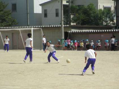 どんぐり拾いで園児が訪れたとき、ちょうどグラウンドでは、3年生の体育で男子がサッカーのゲームをしていました。