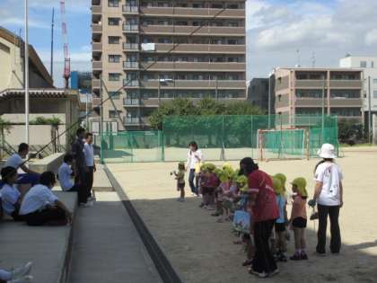 どんぐり拾いの後、サッカーの観戦です。「お兄ちゃん、がんばれー」と声援を送ってくれました。