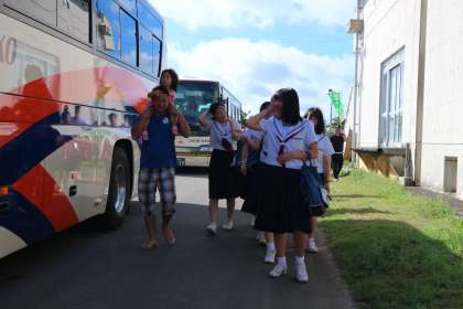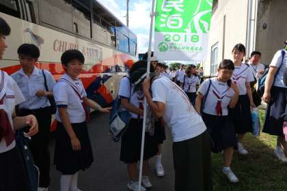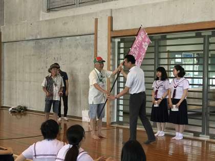 今帰仁村から記念に「のぼり」と「シーサー」をいただきました。