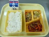 今日の給食は、ごはん、炒めビーフン、カツオカツ、切干大根の炒め煮、牛乳です。ビー...