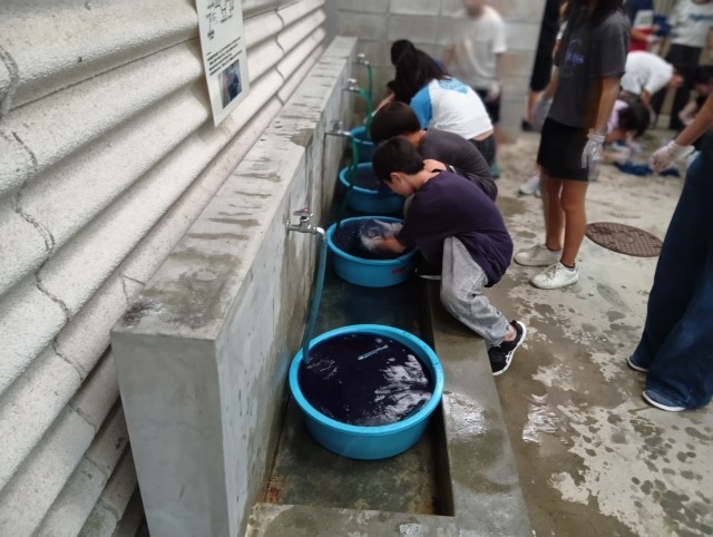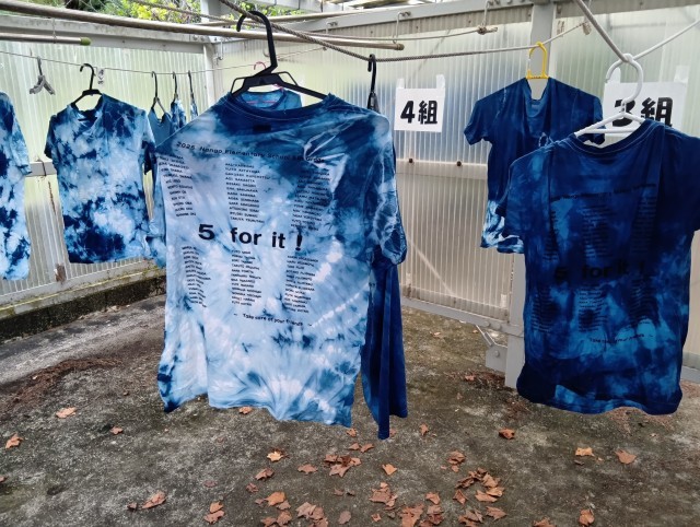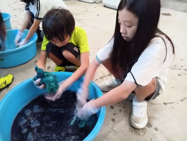 学校で、ビー玉や割りばし、輪ゴムなどを使って絞ったTシャツに藍染めをしていきます。