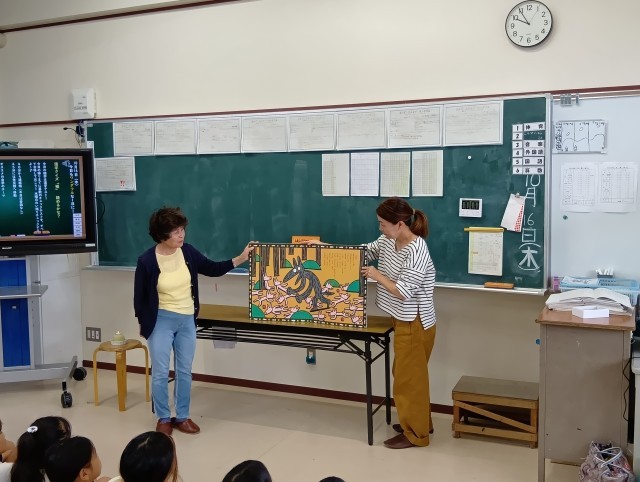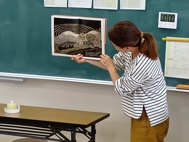 版画でイラストを描いている絵本や巨大絵本、おもしろくためになる絵本などいろいろな種類の絵本を読んでいただき、子どもたちは絵本の世界に飛び込んでいました。