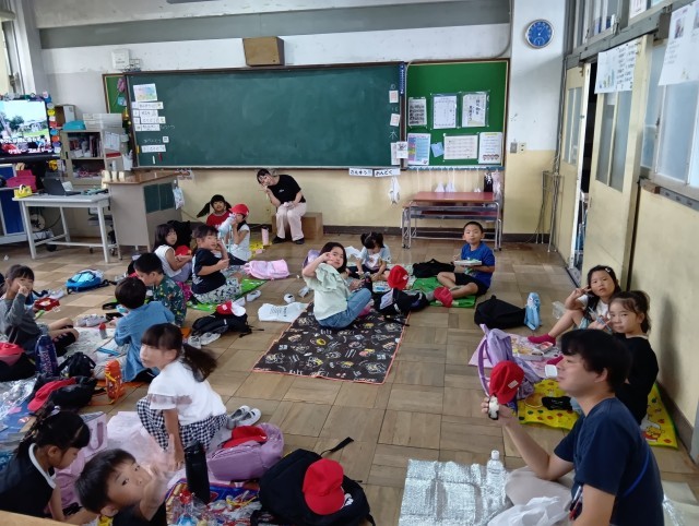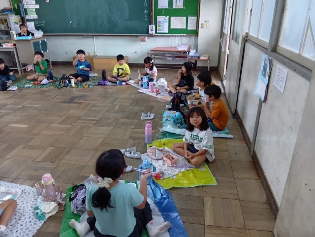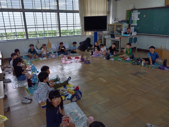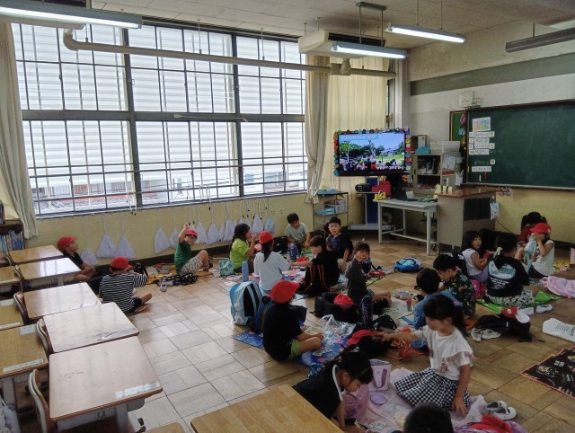 お昼ご飯は給食ではなくお弁当。教室で敷物を敷いて、みんなでお弁当を食べました。