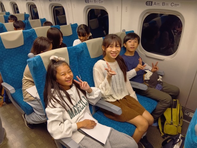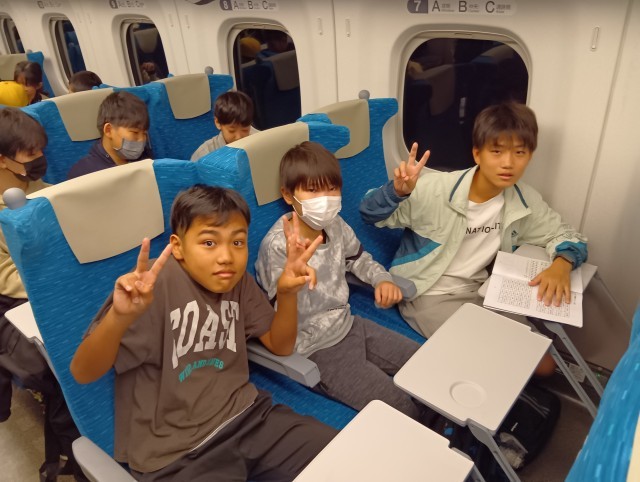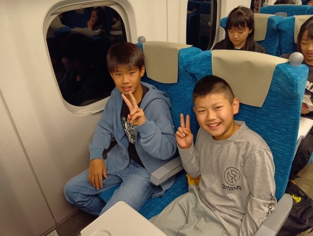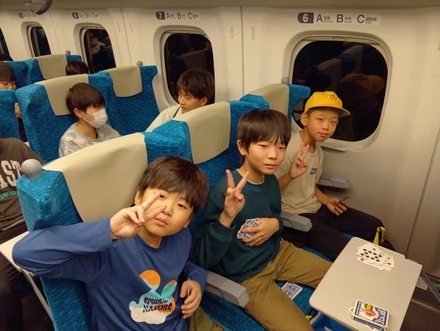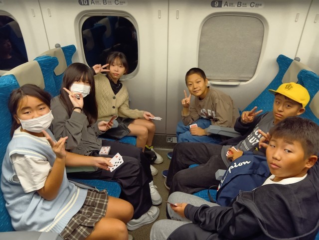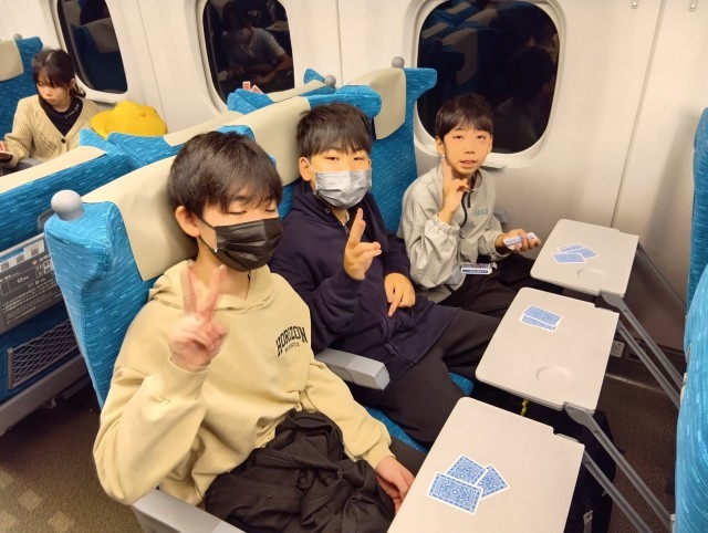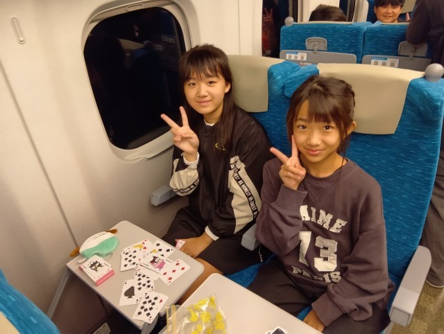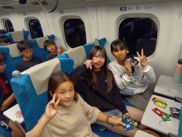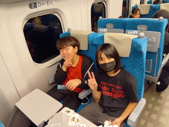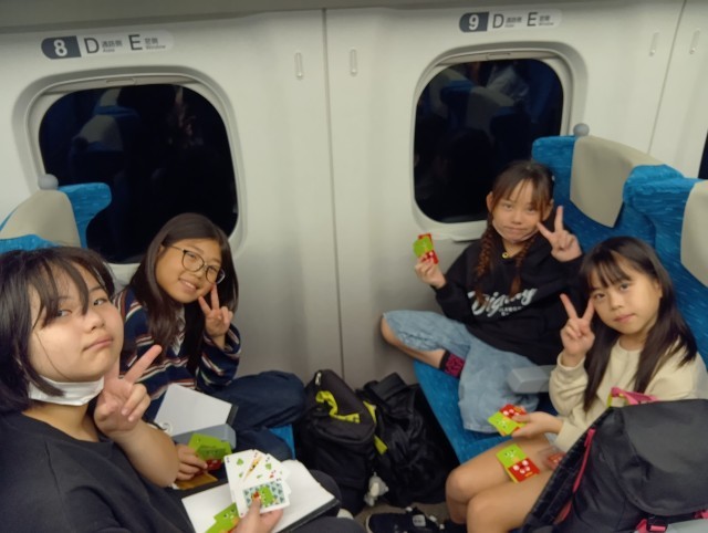 新幹線の車内では、トランプをしたり、おしゃべりをしたりして楽しく過ごしています。