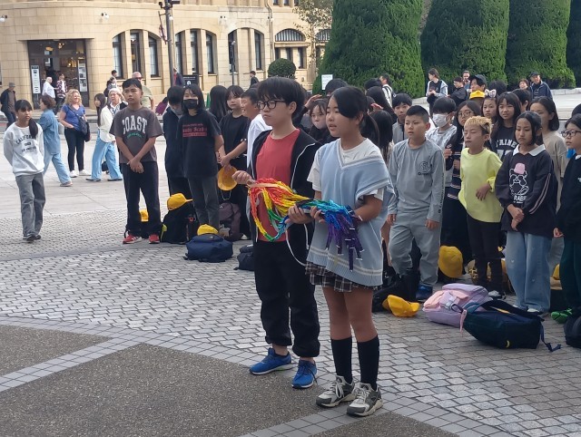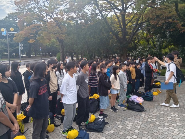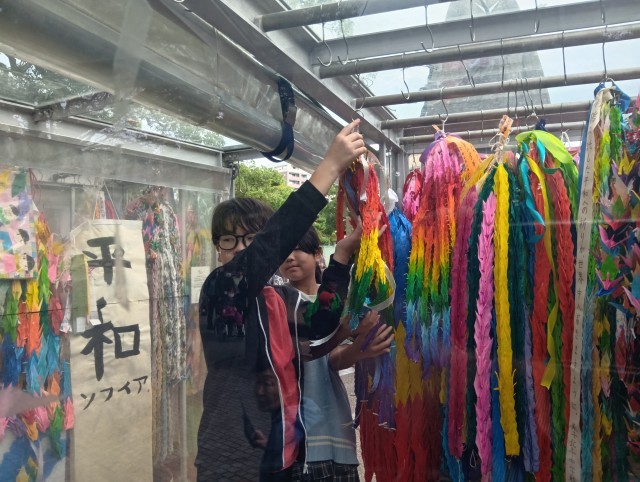 碑めぐりの後、貞子の像の前で平和セレモニーを行いました。