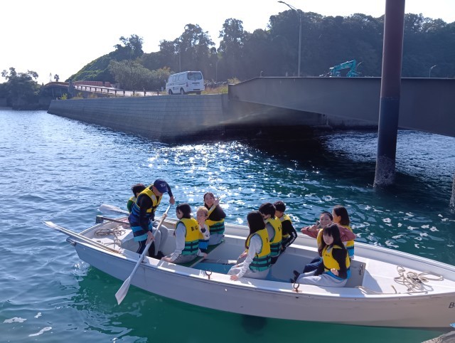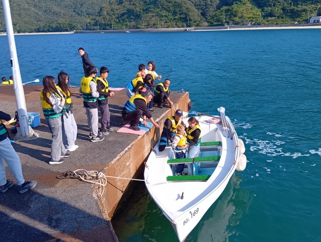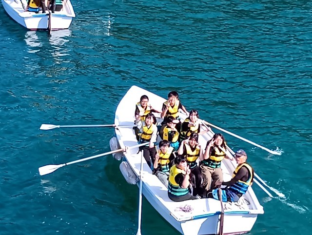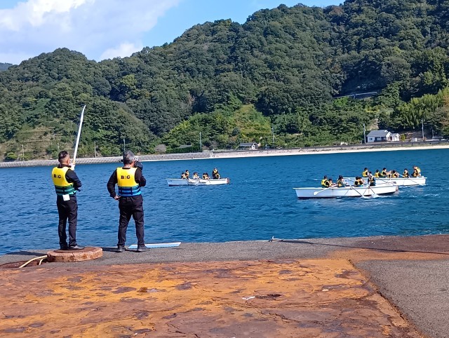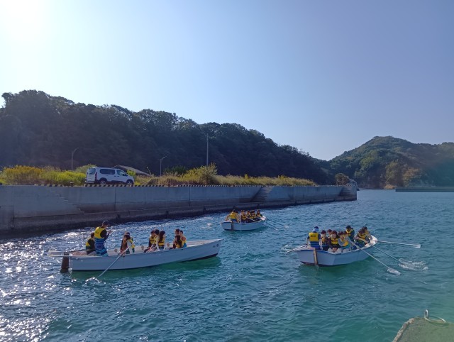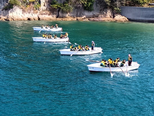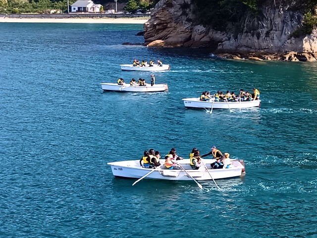 少し波が高く、少し怖い気持ちもありましたが、だんだん慣れてきて、「オーエス!、オーエス!」と声と気持ちを揃えてカッターを漕いでいました。